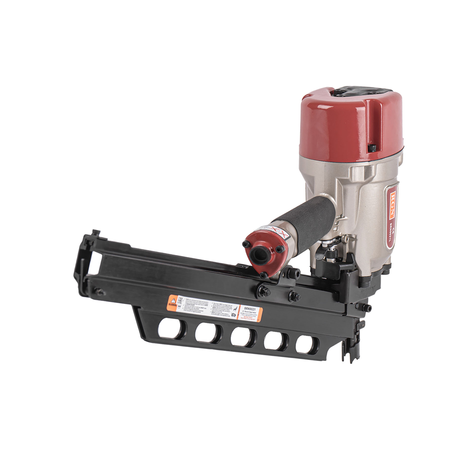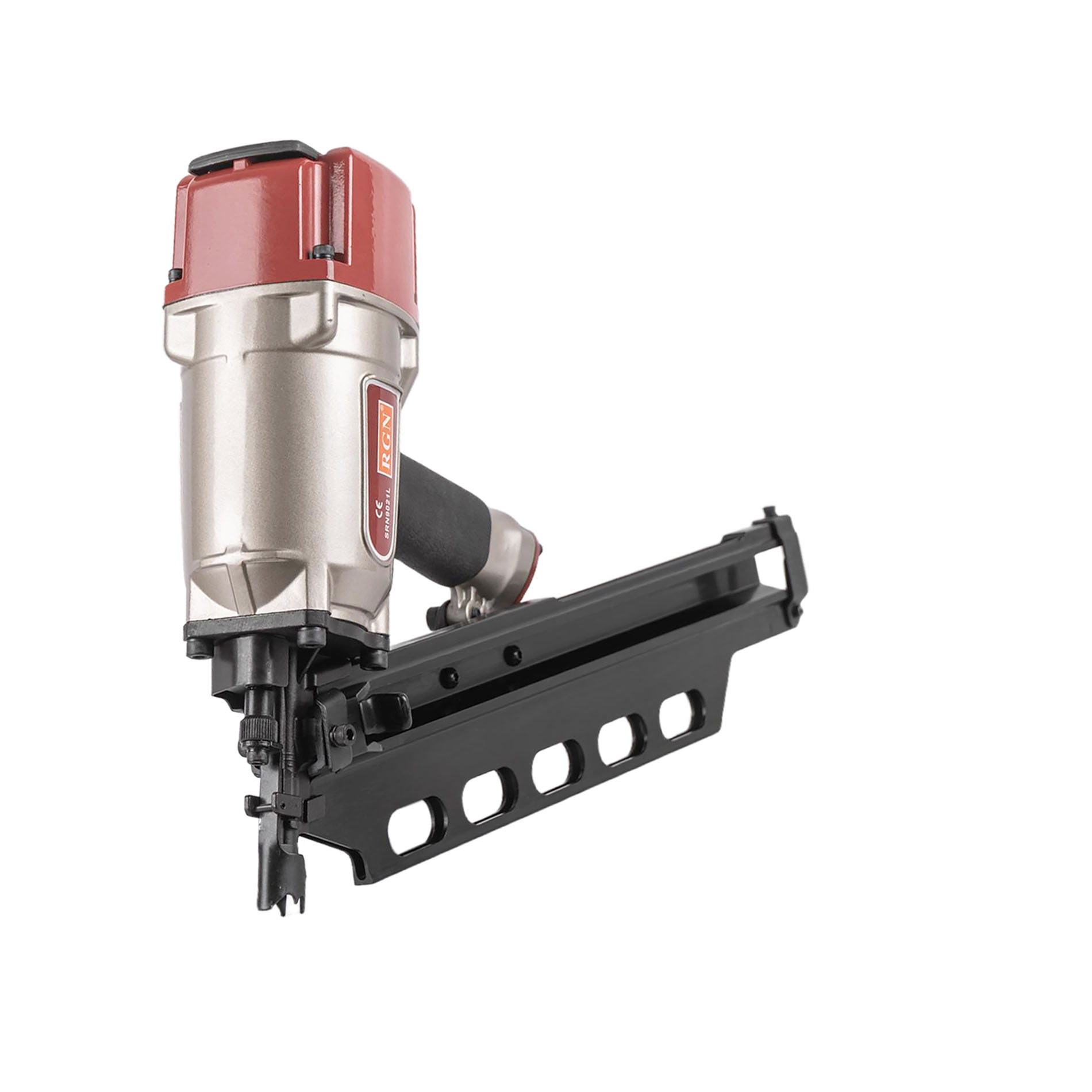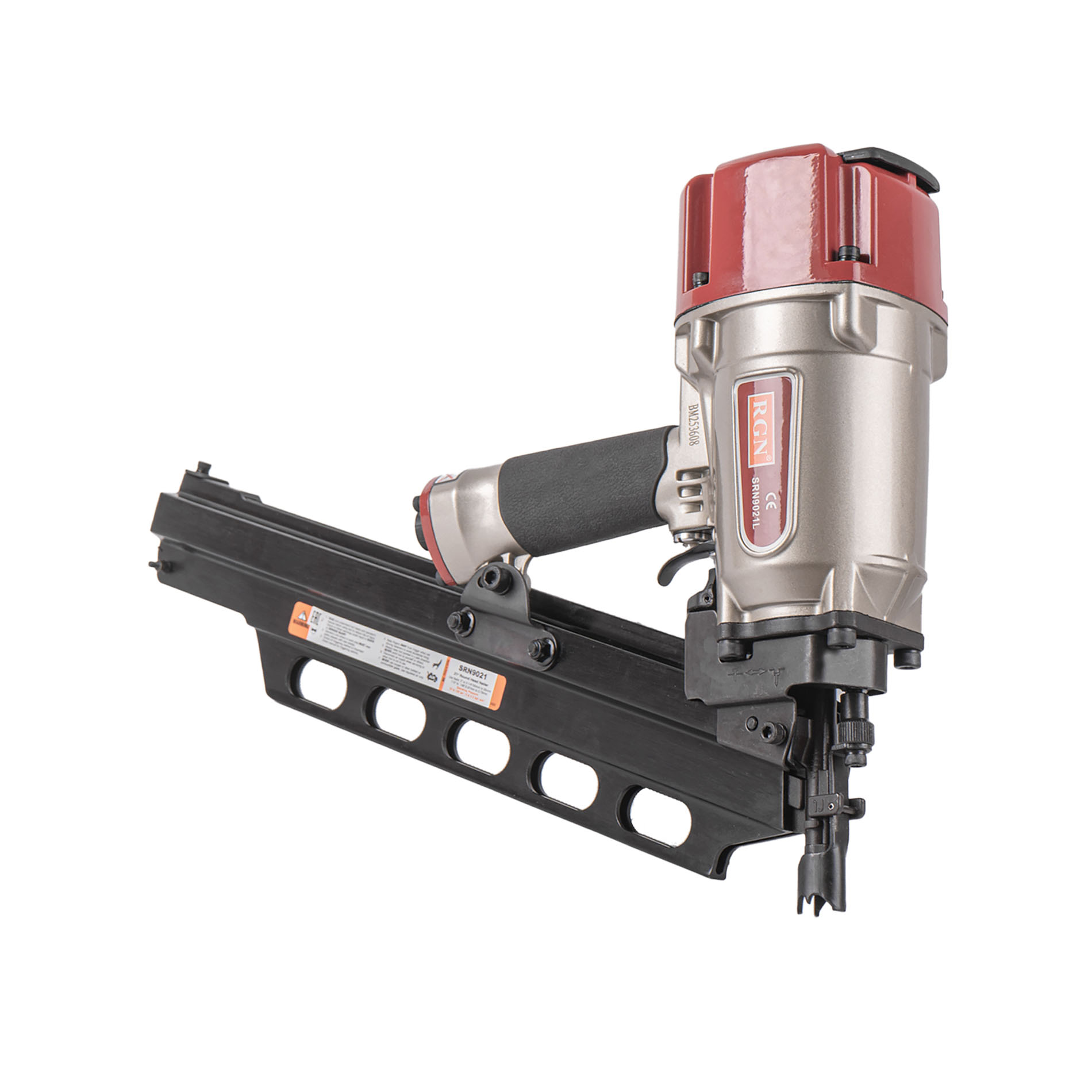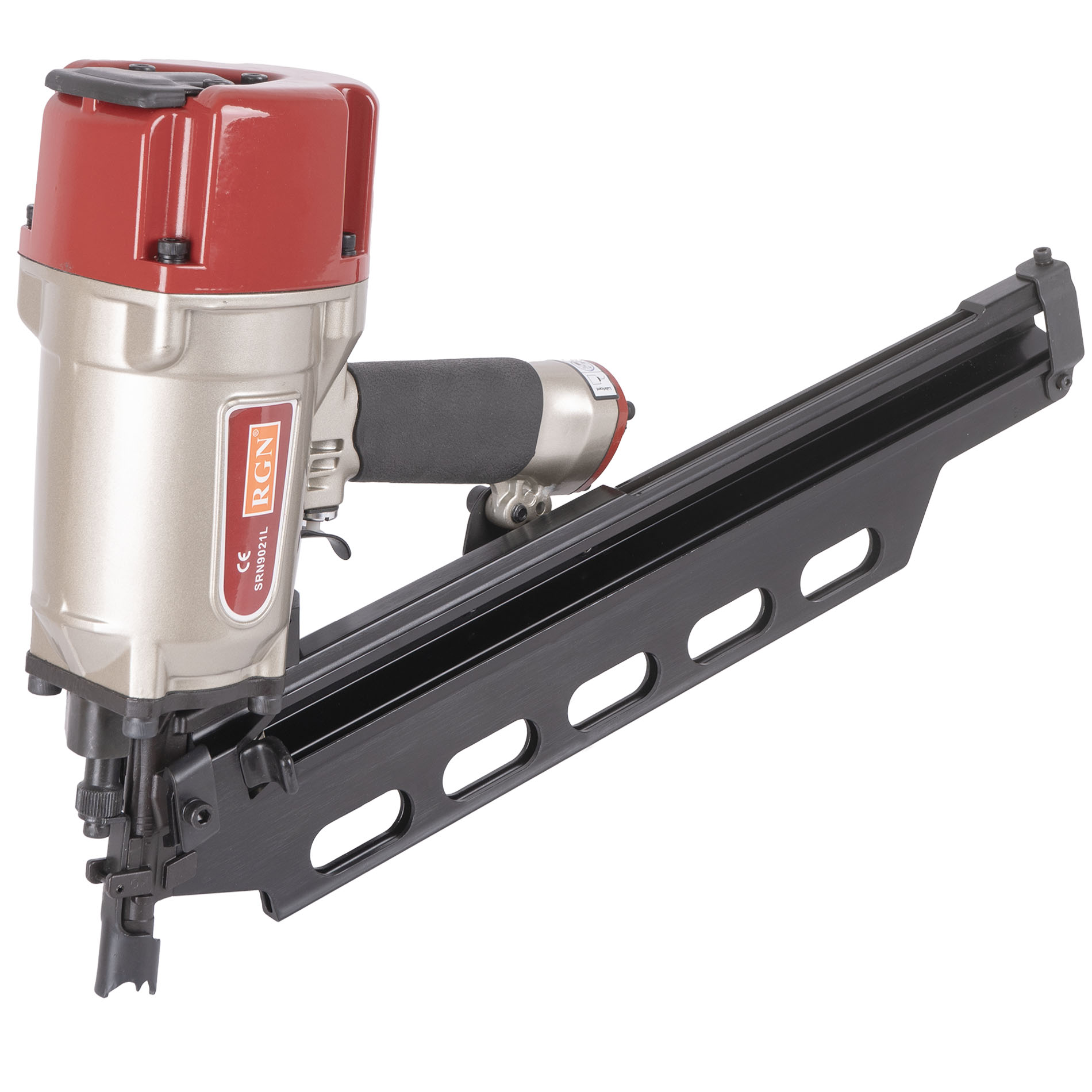 Гвоздезабивной пневматический реечный пистолет RGN SRN9021L для реечных гвоздей в пластиковой обойме с углом наклона 21° и длиной 50-83 мм. Инструмент идеально подойдет для применения в деревянном и каркасном домостроении. Емкость реечного магазина 70 гвоздей, это сравнительно немного и именно поэтому масса снаряженного гвоздями пистолета невелика, что позволяет чрезвычайно удобно оперировать им в труднодоступных местах, в неудобном положении и на вытянутых руках. Инструмент чрезвычайно надежен и прост, его эксплуатация не требует специальных знаний и навыков. Зубчатые зацепы носика предотвращающие его "соскальзывание" с пристреливаемой поверхности, контактный предохранитель исключающий случайный выстрел, регулировка глубины забивания.