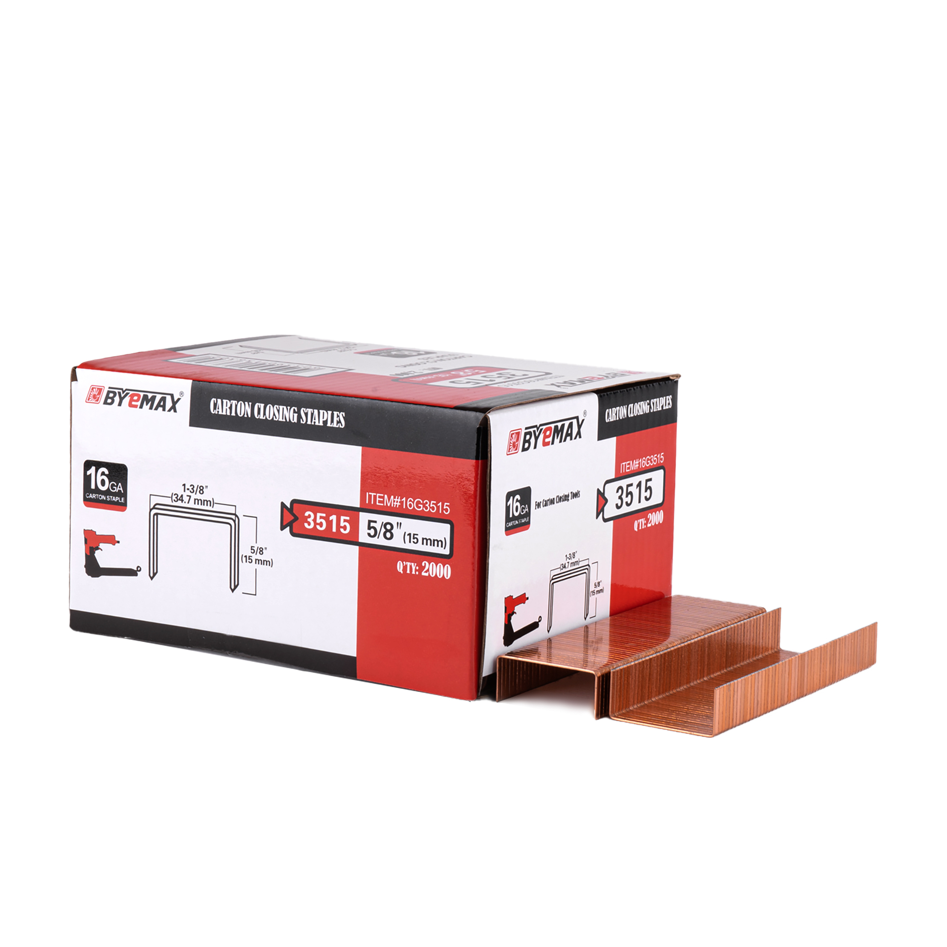 Скобы упаковочные Byemax для гофрокартона тип 35, ширина спинки 34,7 мм, длина ножки 15 мм (калибр 16Ga), для пневматических и ручных скобозажимных инструментов. Широко применяются для сшивания гофротары, имеет медное покрытие. Количество в упаковке 2000 штук. 16G3515